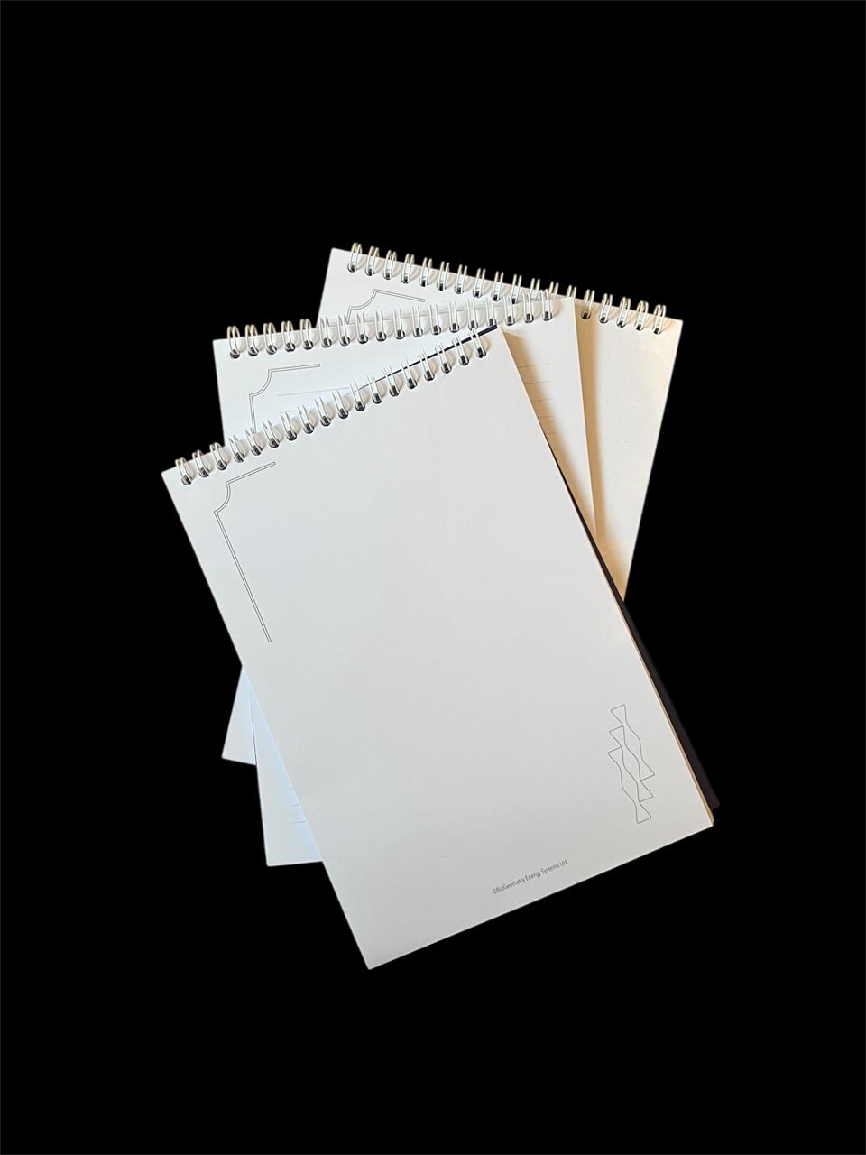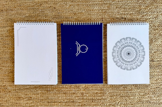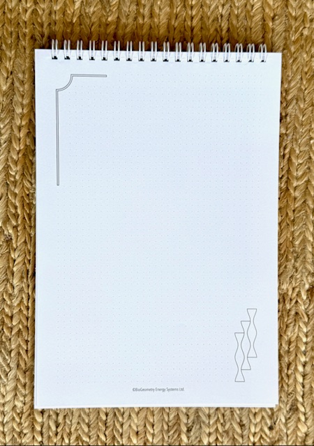 The notebook pages are designed with the BioGeometry “L90” and “Brain Shapes” to create a BG3 emission across the whole page. The L90 shape is notable for its centering effect on the body’s emotional and mental levels and the Brain Shapes for their synergistic effect in harmonizing left and right brain functions by connecting them to BG3. Each set of three notebooks contains one plain, one lined, and one dotted notebook.